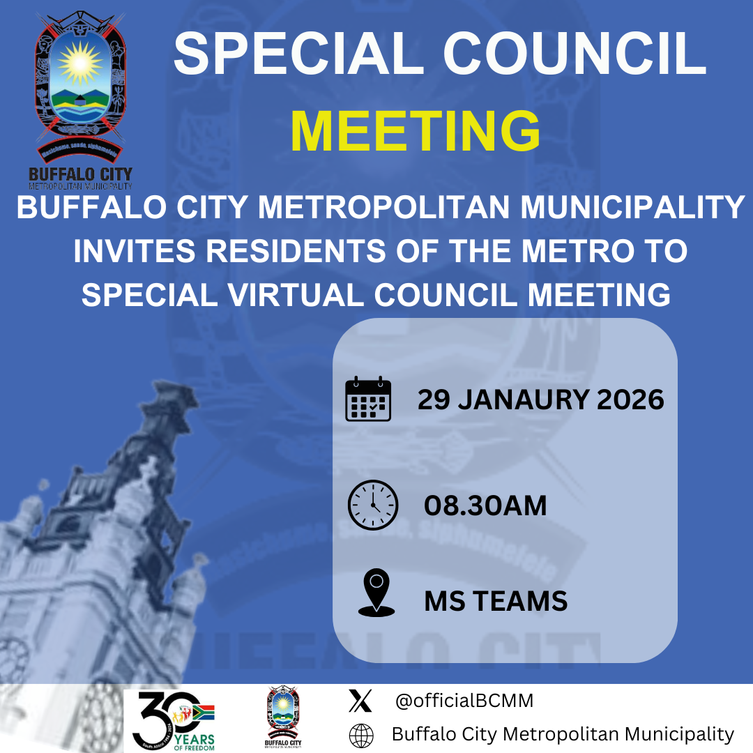 Notice is hereby given in terms of Section 29(1) of the Local Government Municipal Structures Act No. 117 of 1998, read in conjunction with Section 19(b) of the Local Government: Municipal Systems Act, No. 32 of 2000 that the Speaker of the Buffalo City Metropolitan Council, Councilor C.H.M Maxegwana has authorized the City Manager to call a Special Virtual Meeting of the Buffalo City Metropolitan Council on Thursday, 29 January 2026 at 08h30 for 09h00 on Microsoft Teams.