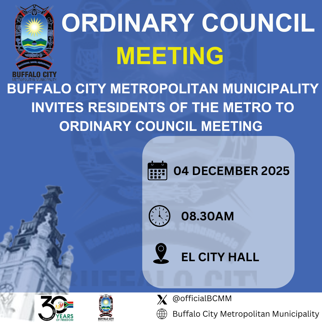 Notice is hereby given in terms of Section 29(1) of the Local Government Municipal Structures Act No. 117 of 1998, read in conjunction with Section 19(a) of the Local Government: Municipal Systems Act, No. 32 of 2000 that the Speaker of the Buffalo City Metropolitan Council, Councilor C.H.M Maxegwana has authorized the City Manager to call an Ordinary Meeting of the Buffalo City Metropolitan Council on Thursday, 04 December 2025 at 08h30 for 09h00 in the Auditorium, City Hall, East London.